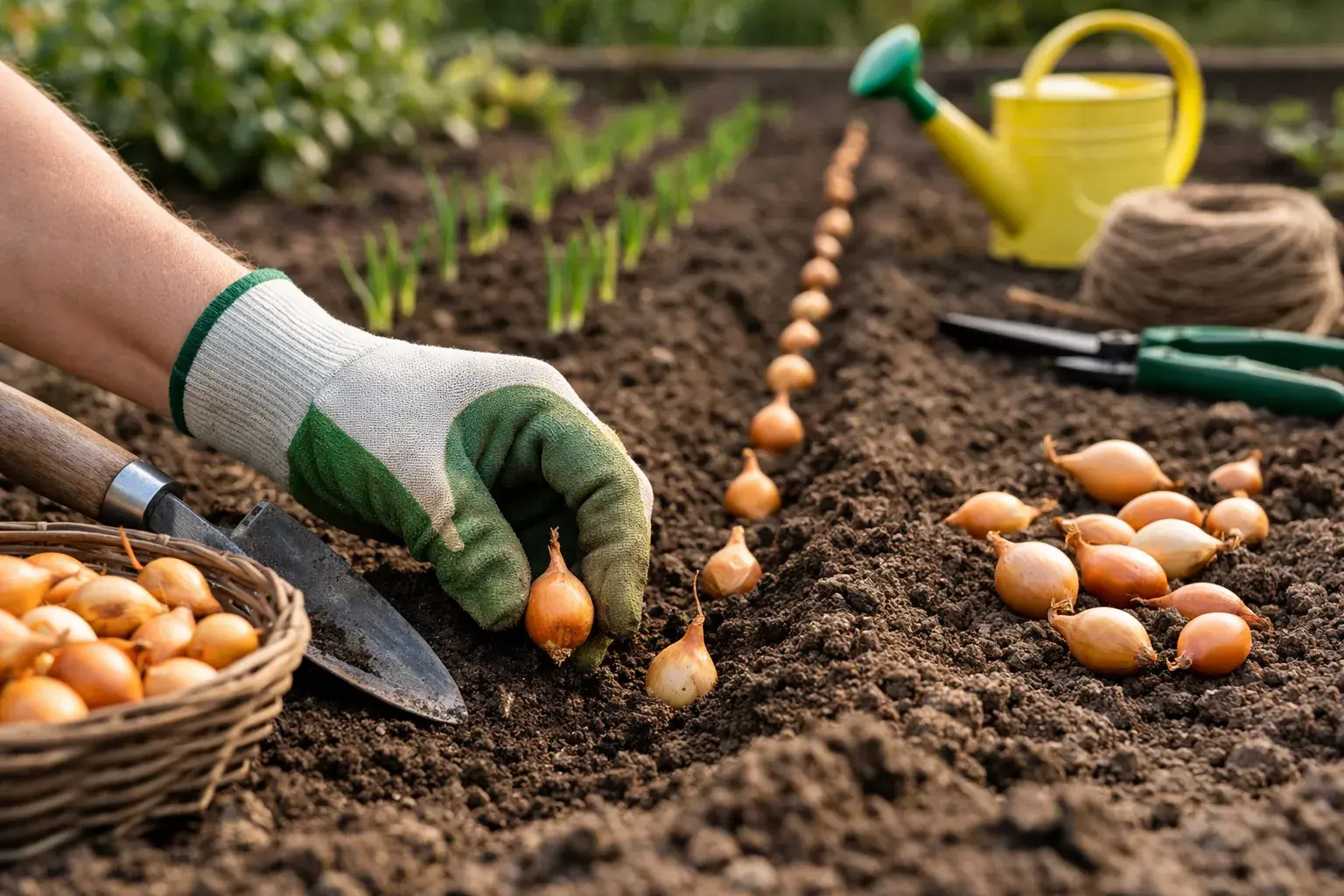 Когда грядка подготовлена, а посадочный материал отсортирован, можно переходить к самой посадке. Правильная схема посадки лука-севка помогает получить ровные ряды, облегчает уход и дает каждой луковице достаточно места для формирования.