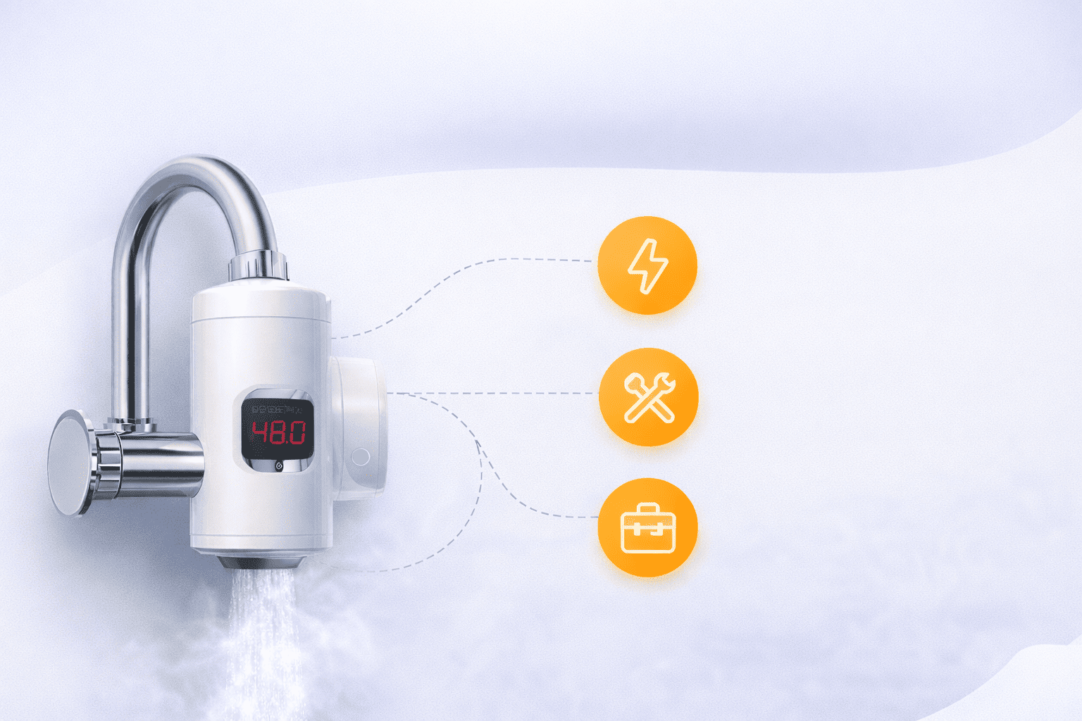 Водонагреватель проточного типа — это электрический прибор, который устанавливается на кран, под раковину или встраивается в систему водоснабжения. Его основная задача — мгновенный нагрев холодной воды до комфортной температуры.