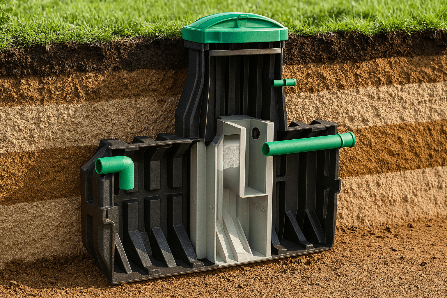 Корпус септика изготавливается методом ротационного литья — это цельная конструкция без сварных швов, а значит, без слабых мест. Толстые стенки и выраженные ребра жёсткости делают систему устойчивой к давлению грунта и морозному пучению.