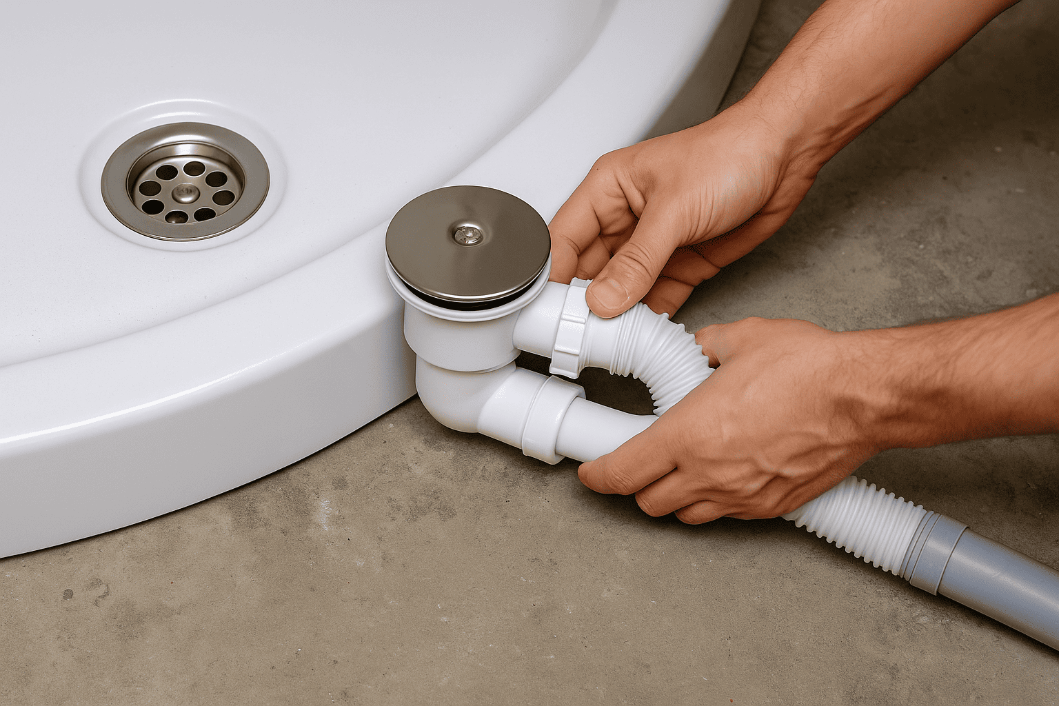 Когда вода попадает в сливное отверстие, она проходит через фильтрующую решётку и поступает в сифон. Внутри сифона часть воды задерживается в колене — это и есть гидрозатвор. Он создаёт водяной барьер, препятствующий выходу запахов из канализации. Остальная вода под действием самотёка уходит через сливную трубу в общий стояк.